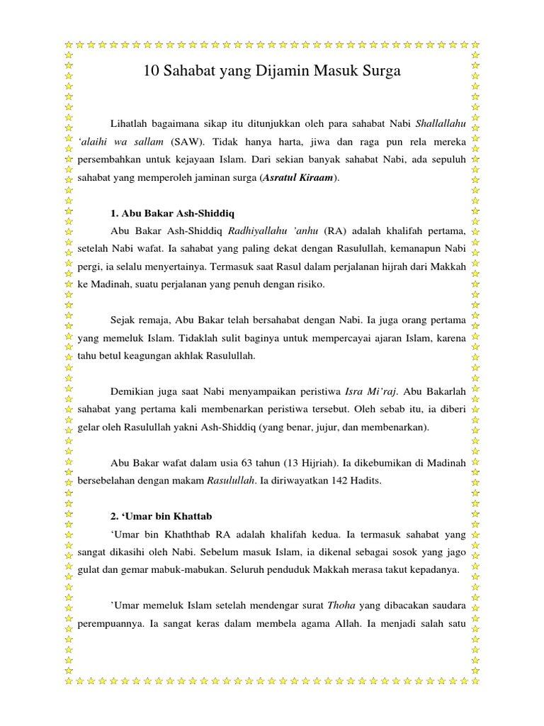 Nah, itulah 10 sahabat nabi muhammad yang dijamin masuk surga dan didampingi oleh para nabi, kita juga pasti ingin seperti sahabat para nabi bukan? Nama terakhir yang meraih jaminan surga adalah abu ubaidah ibnul jarrah, yang akhirnya terpaksa membunuh ayahnya saat badar. Buku ini lebih dari sekadar penuturan kisah sepuluh sahabat yang dijamin masuk surga. Special thanks to ustadzah wiwit (disekolah bias, yang telah memberi catatan ini). Berkata bahwa rasulullah saw bersabda,10 orang pasti masuk surga. Tak kurang dari 40.000 dirham perak, 40.000 dirham emas, 500 ekor kuda perang, dan 1.500 ekor unta ia sumbangkan untuk. Ia memuat fakta sejarah yang pernah dilalui oleh: Umar sendiri merupakan khalifah kedua. Buku ini lebih dari sekadar penuturan kisah sepuluh sahabat yang dijamin masuk surga. Ada sepuluh orang yang dijamin masuk surga? Bagikan informasi tentang 10 sahabat nabi dijamin surga kepada teman atau kerabat anda. Sahabat nabi yang satu ini memiliki keahlian dalam berbisnis sehingga abdurrahman berjuang dengan harta dan jiwa yang dimilikinya, hartanya sangat banyak dan berlimpah, semakin beliau menyedekahkan hartanya semakin. Bahkan saat ia diberitakan rasulullah bahwa dirinya dijamin masuk surga, semangat bersedekahnya semakin membara.