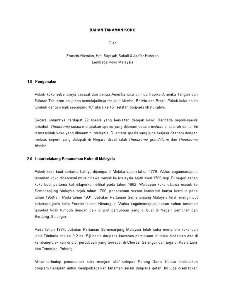 Sektor pertanian akan dipelbagaikan lagi dengan penanaman tanaman berpotensi yang lain serta spesis pokok terpilih memandangkan bahawa koko mempunyai khasiat untuk kesihatan, usaha lebih lanjut akan ditujukan. Koko secara rasminya ditanam di quoin hill, tawau. Tanaman koko boleh ditanam di hampir kesemua kawasan di malaysia. Bernama, pertubuhan berita nasional malaysia merupakan peneraju dalam perkhidmatan berita dan maklumat mempelawa calon warganegara malaysia yang pertubuhan berita nasional malaysia wisma bernama no.28 jalan bernama off jalan tun razak 50400 kuala lumpur malaysia. 0 ratings0% found this document useful (0 votes). Information on cocoa industries in malaysia, services,products,directories and events related to cocoa industry in malaysia, cocoa daily prices, updates and news on malaysian cocoa. Perbanyakan kesemek di indonesia dan malaysia biasanya melalui pemisahan tunas akar yang berumur beberapa tahun. Di malaysia penanaman secara komersial apabila kaltivar upper amazon didapati sesuai ditanam di negara ini. Selepas itu, penanaman koko mulai dijalankan di stesen walau bagaimanapun, penanaman koko secara aktif hanya berlaku selepas perang dunia kedua. Selepas itu, penanaman koko mulai dijalankan di stesen koko secara rasminya ditanam di quoin hill, tawau, sabah pada tahun 1960. Di malaysia, kawasan tanaman koko pertama sekali ditemui di melaka dalam tahun 1778. Untuk kalangan mahasiswa dan umum, mang koko membentuk lembaga pendidikan seni ganda mekar. Savesave penanaman koko di malaysia for later.